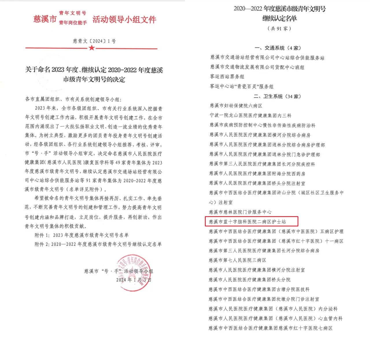 近日,慈溪市青年文明號(hào)、青年崗位能手活動(dòng)領(lǐng)導(dǎo)小組印發(fā)了《關(guān)于命名2023年度、繼續(xù)認(rèn)定2020-2022年度慈溪市級(jí)青年文明號(hào)的決定》,慈溪藍(lán)十字腦科醫(yī)院二病區(qū)護(hù)士站再次被認(rèn)定為“慈溪市級(jí)青年文明號(hào)”,這是他們連續(xù)四年獲此殊榮。