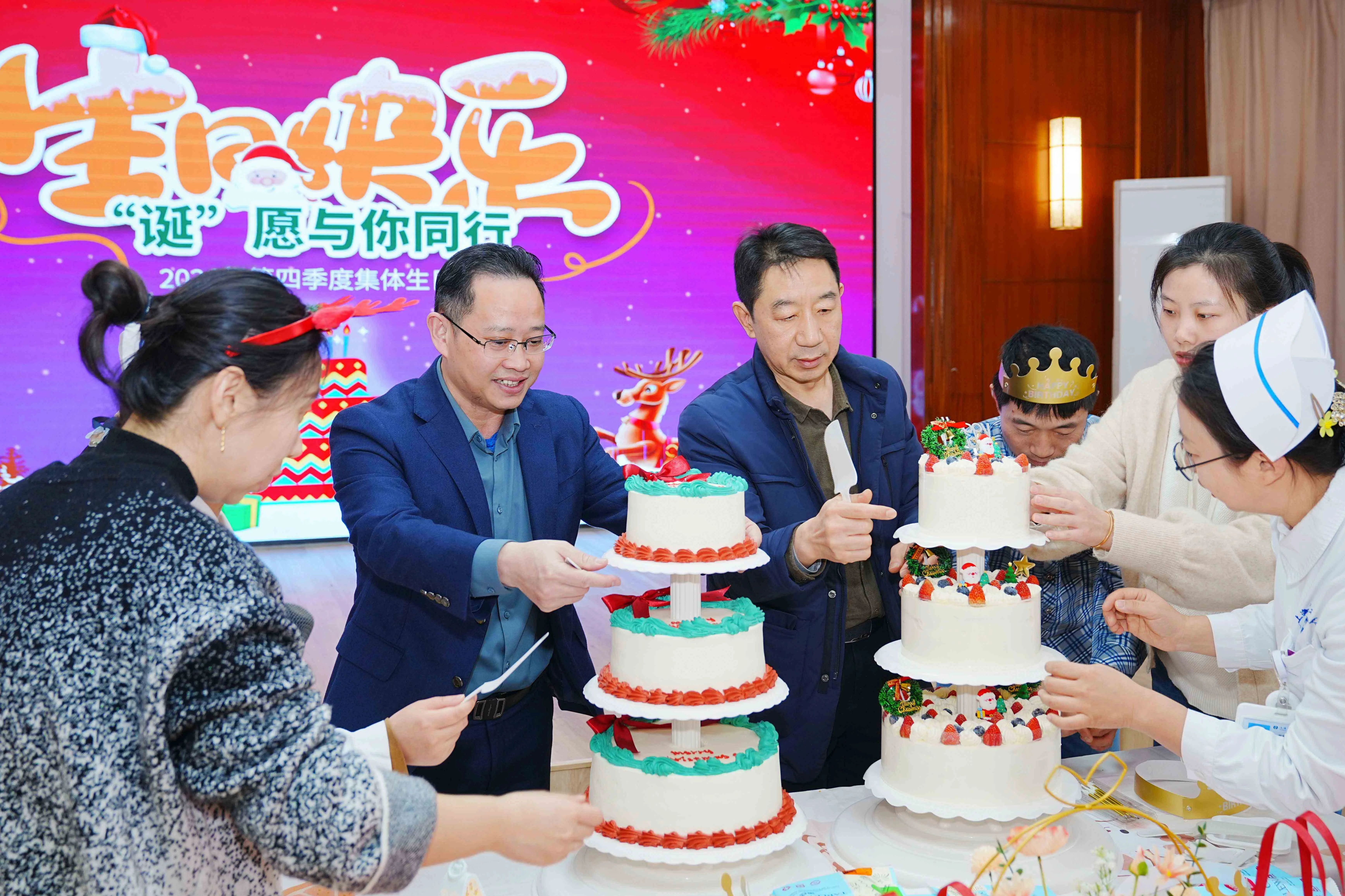 生日祝福歌聲響起,“壽星”代表許下美好愿望,“誕”愿與你一路同行。作為本季度生日會(huì)的壽星,周宏宇院長和林志強(qiáng)總經(jīng)理親自為大家切蛋糕,同享生辰喜悅!