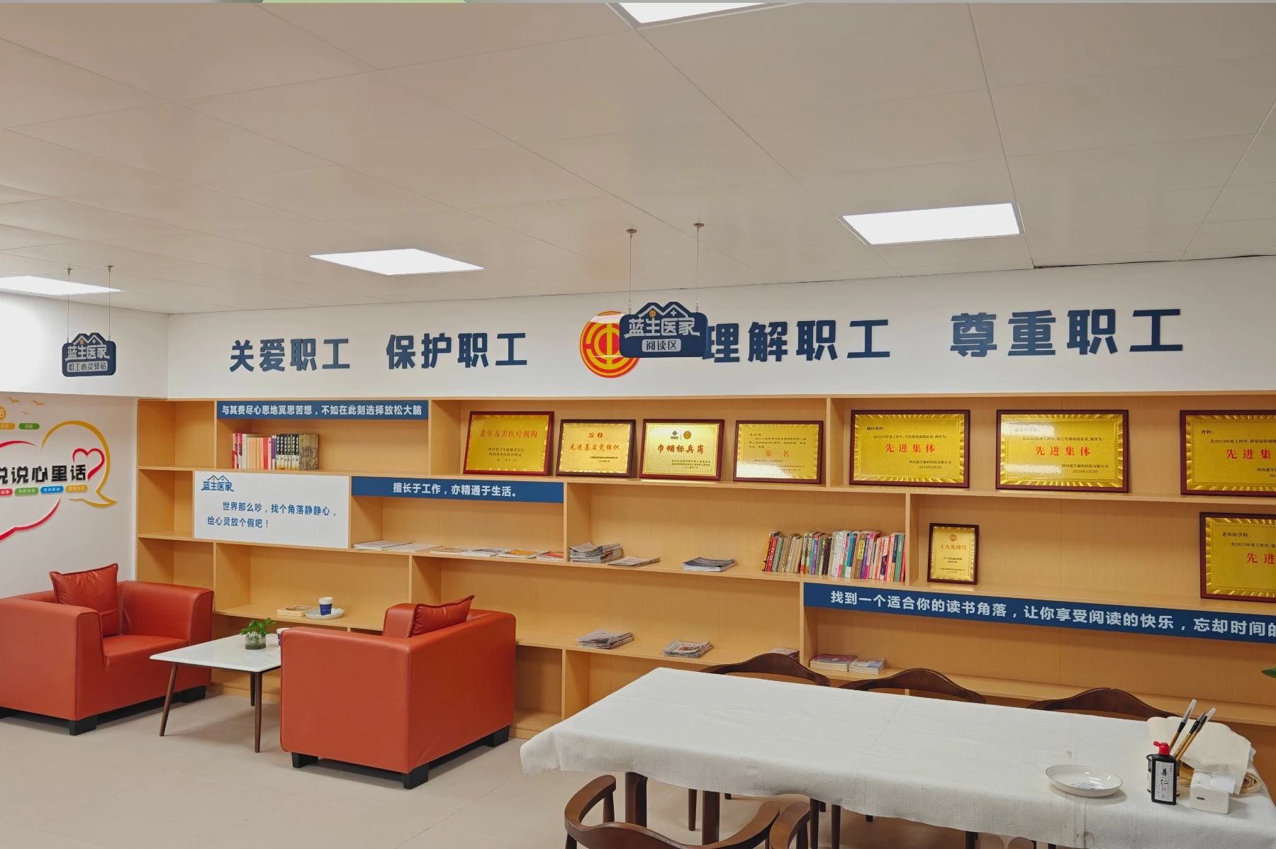 職工之家位于醫(yī)院4號(hào)樓六樓,設(shè)計(jì)巧妙融合了現(xiàn)代簡(jiǎn)約與傳統(tǒng)美學(xué),為職工打造了一個(gè)集休息、學(xué)習(xí)、交流與放松于一體的全方位多功能空間。這里設(shè)有舒適的休閑區(qū),供職工放松疲憊身心;運(yùn)動(dòng)區(qū)配備了齊全的健身設(shè)施,鼓勵(lì)職工保持活力與健康;溫馨的閱讀角則提供了豐富的醫(yī)學(xué)書(shū)籍與人文讀物,滋養(yǎng)心靈,拓寬視野。