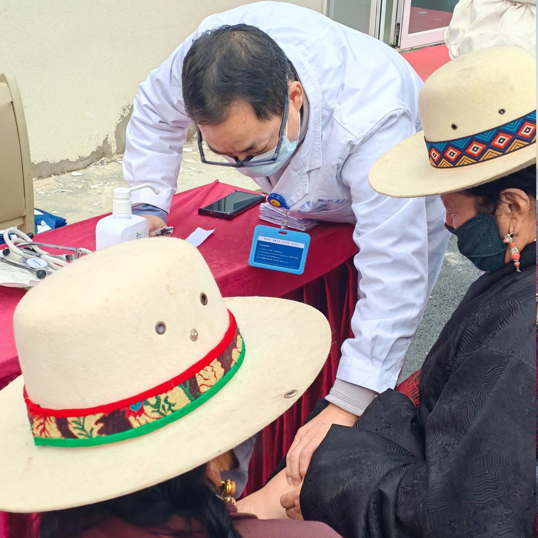 義診現(xiàn)場(chǎng),段勇將主任帶領(lǐng)醫(yī)療小組有條不紊地開(kāi)展工作。他們俯身細(xì)致檢查每一位患者的膝關(guān)節(jié)、髖關(guān)節(jié)及腰椎狀況,精準(zhǔn)診斷疾病隱患;護(hù)士們?yōu)榫用駵y(cè)量血壓,一邊輕聲安撫緊張的老人,一邊快速記錄健康數(shù)據(jù);藏漢雙語(yǔ)翻譯穿梭于人群中,用藏語(yǔ)輕聲傳遞醫(yī)生的專業(yè)診斷和治療建議以及“減少負(fù)重勞作”“注意關(guān)節(jié)保暖” 等醫(yī)囑,鼓勵(lì)他們樹(shù)立戰(zhàn)勝疾病的信心。