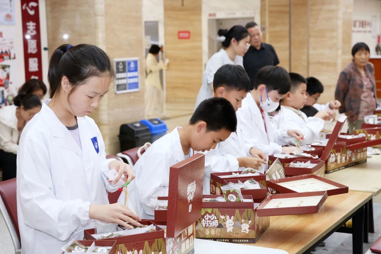 每個孩子的桌前,都整齊擺放著醫(yī)院特別準備的“小小中藥師”香囊制作箱。箱內(nèi)不僅有八種常用藥材原料包,還配有仿古銅桿秤、木質(zhì)搗藥臼、古風(fēng)包藥紙和香囊袋,孩子們可以完整體驗傳統(tǒng)中藥材香囊的制作流程,沉浸式體驗中醫(yī)文化的博大精深。