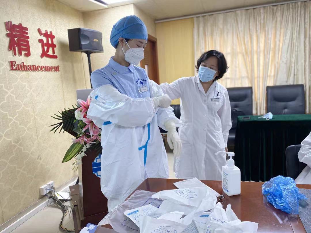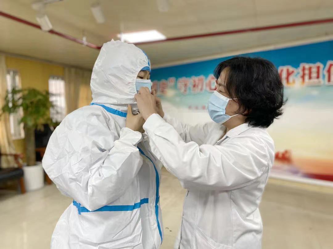四病區(qū)護(hù)士長于如如現(xiàn)場指導(dǎo)示范穿戴防護(hù)服和消毒隔離的正確操作,通過結(jié)合視頻課件和實(shí)操培訓(xùn),隊(duì)員們逐一通過考核并完成采樣崗前防控培訓(xùn)。