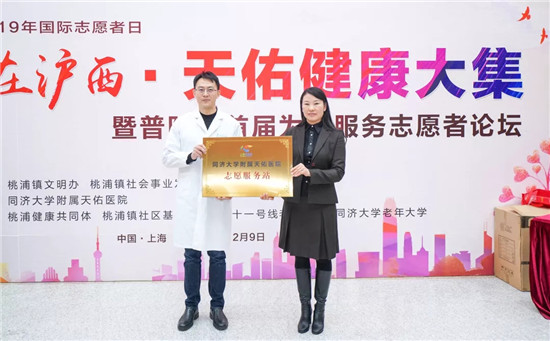 12月2日下午,天佑醫(yī)院成功舉辦了第四屆“愛在滬西 天佑健康大集”。在這次大集上,桃浦鎮(zhèn)文明辦副主任秦春華為“同濟大學附屬天佑醫(yī)院志愿服務站”授牌。